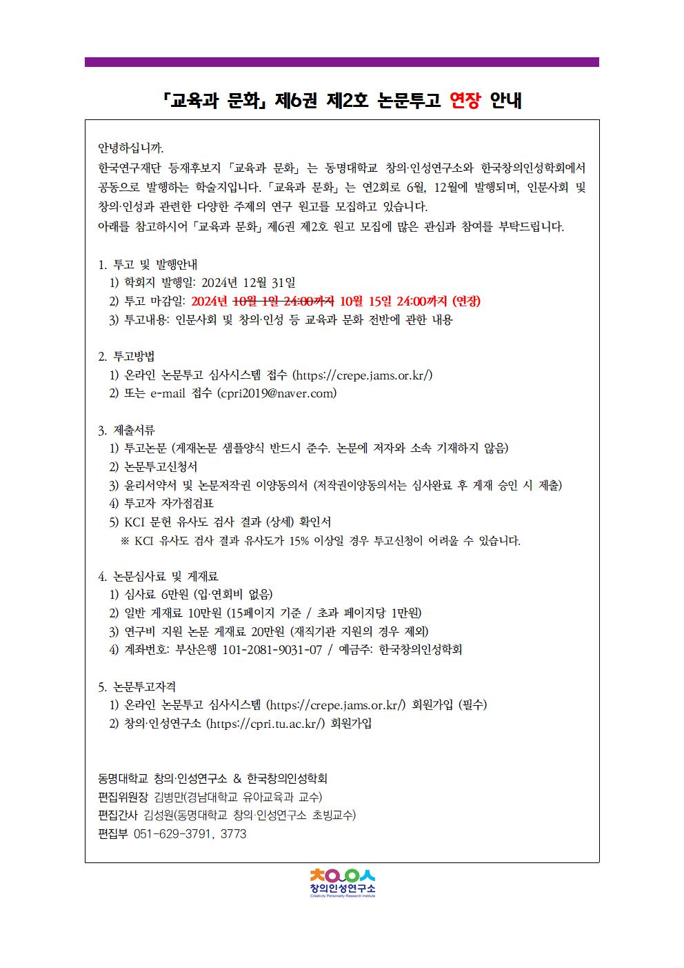 창의·인성연구소 등재후보지「교육과 문화」제6권 제2호 논문투고 연장 안내