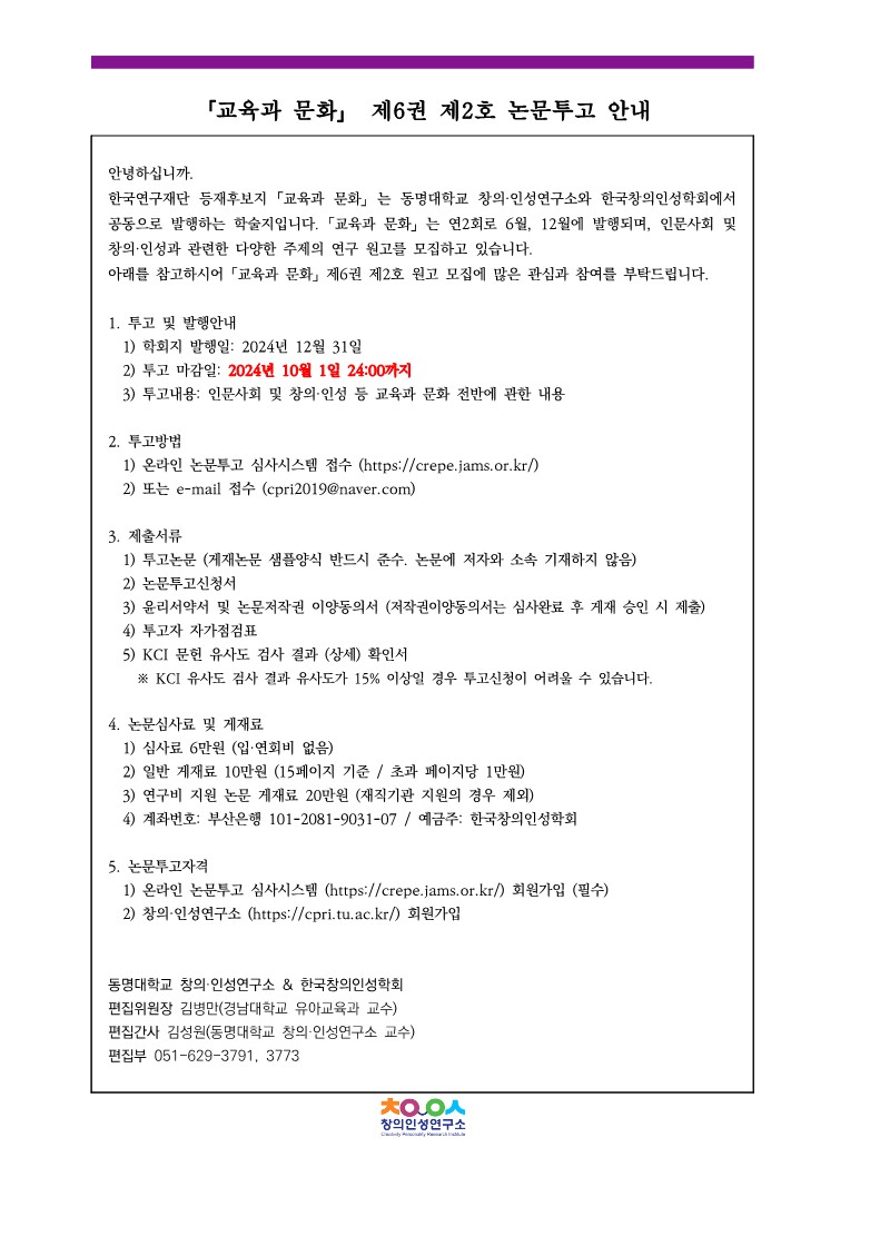 창의·인성연구소 등재후보지「교육과 문화」제6권 제2호 논문투고 안내